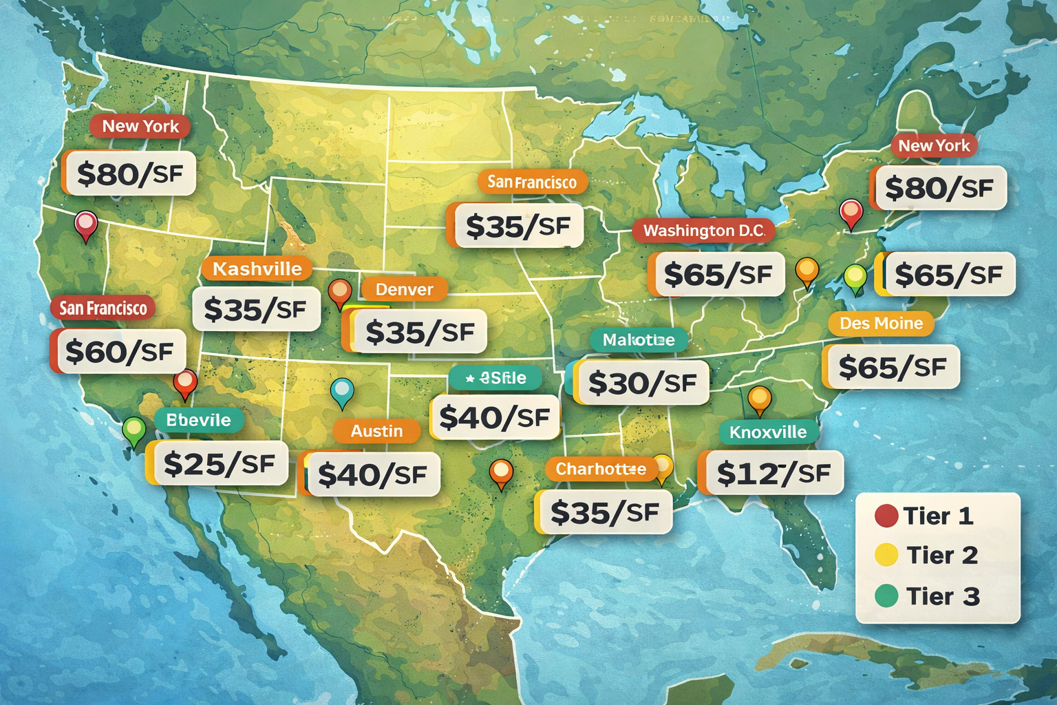 A similar space in Oklahoma might cost $10 per square foot.